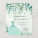 Une invitation branchée pour une Quinceañera, fête du 15ème anniversaire, enchantée thème de la forêt. Un arrière - plan vert à l'eau avec des fougères et de la verdure d'eucalyptus, une robe verte. Le nom est écrit avec un script de style moderne écrit à la main. Personnalisez et ajoutez les détails de votre fête.