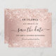 Une carte Save the Date pour une Quinceañera, 15e anniversaire. Un arrière - plan à l'aspect métallique doré rose décoré de poussière de parties scintillant imitation. Personnalisez et ajoutez une date et un nom/âge. Le texte : Save the Date est écrit avec un grand script de style à la main tendance avec des swashes.