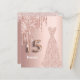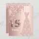 Elégante, classique, glamour et girly style Quinceañera, invitation à 15e anniversaire. Une robe en or rose avec fausse parties scintillant rose en or goutte à goutte. arrière - plan d'or rose faux métallique. Personnalisez et ajoutez son nom sur le devant. Le numéro 15 est écrit avec une police de style ballon. Ajoutez les détails de votre événement sur le dos, lettres noires.