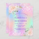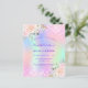Une Quinceañera féminine et féminine, 15ème anniversaire invitation à la fête. Devant : Un arc-en-ciel, arrière - plan de couleur holographique en violet, rose, vert menthe, or rose. Décoré de faux parties scintillant rose vif, brille. Personnalisez et ajoutez un nom et des détails du parti. Le nom est écrit avec un script de style écrit à la main, des lettres de couleur violette.