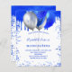 Un arrière - plan blanc. Décoré avec la fausse parties scintillant bleue royale gouttes de peinture goutte à goutte, scintille. Ballons Royal bleu et faux argent. Personnalisez et ajoutez un nom et des détails du parti. Le nom est écrit avec un script de style écrit à la main.