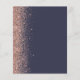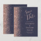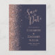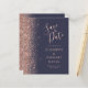 Le bord gauche de cet élégant mariage moderne, à l'exception de la carte de date, est orné d'une bordure en faux parties scintillant en or rose. Le texte personnalisable combine écriture rose couleur or pâle, couleur blush, cuivre et polices italiques sur un arrière - plan bleu foncé. L'envers est assorti d'un design en or bleu foncé et rose.
