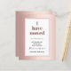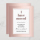 Un arrière - plan rose d'or faux métallique et féminin. Avec le texte : J'ai bougé. Personnalisez et ajoutez votre nouvelle adresse et votre nouveau nom. Script minimaliste et moderne, polices. Or rose foncé et lettres noires.