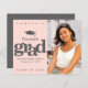 Annoncez au monde que votre groupe favori a atteint son jalon avec cet invitation faire-part à budget unique, simple, moderne et personnalisé. Une typographie grise, grise, grise et une icône de casquette recouvrent un arrière - plan rose pâle. Sur la droite, ajoutez une photo de votre choix. Personnalisez le texte personnalisé avec le nom de votre diplômé, le nom de l’école, la date et l’année de classe. Au verso, ajoutez votre note personnelle, la prochaine école où ils vont, les renseignements sur la fête, etc. Garanti d'ajouter du plaisir élégant à leur occasion spéciale! Il suffit de remplacer l’échantillon de photo par un de vos propres, de taper les informations de votre grade, de customiser le message au dos, et de personnaliser facilement cette invitation de faire-part de graduation budgétaire. S'il vous plaît, envoyez-moi un message avec toute question ou demande.