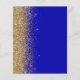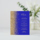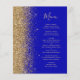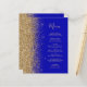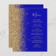 Le bord gauche de cet élégant menu mariage moderne présente une bordure de parties scintillant en faux or. Le texte personnalisable combine un script d'écriture fantaisiste couleur or et des polices de cuivre sur un arrière - plan bleu royal. L'envers affiche une parties scintillant bleu royal et or assortie.