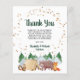 Un carte de remerciements de baby shower rustique abordable avec une mignonne illustration d'animaux boisés avec leur tente campant dans les montagnes et la forêt, une superposition d'étoiles dorées et de "Merci" et les noms des parents dans un script vert de chasse sombre.