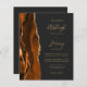 Économisez le coût d'impression et d'envoi de cartes RSVP séparées avec cet élégant faire-part de mariage tout-en-un moderne. Le bord gauche est doté d'une bordure d'aquarelle couleur orange brûlée et rouille, recouverte d'une fausse parties scintillant dorée. Le texte personnalisable combine écriture manuscrite dorée, cuivre et polices italiques sur un arrière - plan noir ardoise. L'envers offre de l'espace pour les détails mariages sur un arrière - plan noir en ardoise solide, ainsi qu'un code QR que les invités peuvent scanner pour visiter votre site Web et RSVP.