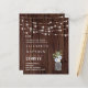 Donnez le ton pour la fête de votre pays avec ces articles de papeterie mariage rustique avec un arrière - plan en bois chaleureux, des lampes à cordes brillantes et de charmants bocaux en maçon. Parfait pour les mariages de grange, les fêtes de plein air ou les soirées douillettes, ce design rustique crée une atmosphère accueillante et romantique. Customisez avec vos noms, les détails du mariage et l'information de l'événement pour concevoir l'invitation parfaite / papeterie qui reflète votre style rustique.