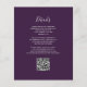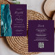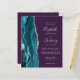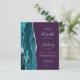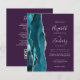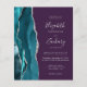 Le bord gauche de cette élégante invitation de mariage moderne présente une bordure d'agate aquarelle bleu sarcelle rehaussée de fausse brillance argentée. Le texte personnalisable combine des polices manuscrites, copperplate et italiques de couleur gris argent sur fond violet. Le verso offre un espace pour les détails du mariage sur un fond violet uni, ainsi qu'un code QR que les invités peuvent scanner pour visiter votre site web et répondre, ce qui permet d'économiser le coût d'impression et d'envoi de cartes de réponse séparées.