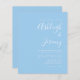 Ce faire-part de mariage moderne simple est composé d'un texte blanc sur un arrière - plan bleu bébé pastel. Ajoutez les noms de la mariée et du marié en calligraphie stylisée et les détails en police sans serif. L'envers est assorti d'une teinte bleu bébé solide.