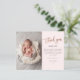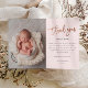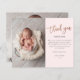 Cette photo moderne de remerciement note comprend un script manuscrit en or rose, un message personnel et une photo verticale sur le devant. Le dos comprend une deuxième photo bébé qui est une photo horizontale à fond saigné.