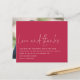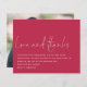 Un rapport qualité-prix BUDGET alternative sur une taille plus petite 4,5 x 5,6" semi-brillant poids 110lbs, qui est d'une épaisseur similaire à une carte postale (cependant ne convient pas à l'utilisation comme carte postale.) VEUILLEZ NOTER qu'il ya UN invitation par feuille Script Love Thanks Photo Mariage Magenta Merci. L'amour et les remerciements se font dans un style manuscrit avec les détails en dessous. Beaucoup d'espace au sommet pour une touche contemporaine ! Personnalisez facilement le reste du texte à vos propres détails et remplacez l'exemple de photo au dos par le vôtre.