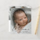 Script moderne Welcome Baby Photo Détails de naissance Carte de remerciements. Le dos comprend une deuxième photo et un message de remerciement que vous pouvez personnaliser ou supprimer si vous préférez écrire à la main votre remerciement. Cliquez sur le bouton Modifier pour customiser cette conception.