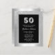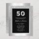 Budget Parties scintillant Argent Foil Ombre 50e anniversaire de fête Invitation... Sur un arrière - plan de feuille métallique argentée, notre 50e invitation de fête d'anniversaire présente une élégante parties scintillant d'ombre argentée superposée avec de très grands numéros de ballon affichant le numéro 50. Dans un cadre noir avec une bordure en feuille d'argent, vous trouverez un exemple de texte d'invitation d'anniversaire que vous pouvez facilement modifier sur le modèle de personnalisation. L'arrière de cette invitation à la fête du 50e anniversaire de l'jalon du budget montre également le design unique et sombre de la parties scintillant.