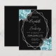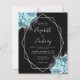 This elegant modern wedding invitation features a silver geometric frame decorated with aqua and silver flowers on a black background. The customizable text combines silver gray whimsical handwriting, copperplate and italic fonts. The reverse side is solid black.