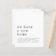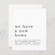 Simple Moving New Home Détails. Une alternative économique SMALLER 4.5" x 5.6" pour conseiller votre nouvelle adresse. Disponible dans un STOCK SEMI GLOSS 110 lb CARD ou un STOCK SATIN FINISH 80 lb THINNER PAPER. Les enveloppes sont en option. L'en-tête est grand en minuscule élégant avec les détails en dessous. Beaucoup d'espace blanc au sommet pour une ambiance contemporaine ! Personnalisez facilement le texte à vos propres détails.