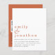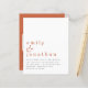 Mariage de texte simple QR Code Terracotta. Un prix économique PETIT 4,5 po x 5,6 po alternatif. Disponible dans un STOCK SEMI-GLOSS 110 lb CARD qui est l'option par défaut (plus épais pour les invitations), OU un STOCK SATIN FINISH 80 lb THINNER PAPER (idéal pour les boîtiers). Ajoutez votre code QR à votre site Web mariage au dos fait de cette option pratique pour vos invités à RSVP et voir tous les détails sans avoir besoin de RSVP séparé et de cartes de détails. Simple et. Informel, vos prénoms sont grands en minuscules élégantes en terre cuite avec les détails en dessous. Personnalisez facilement le texte. Sur le dos est une terre cuite de coordination.