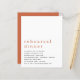 Budget Simple Répétition en Terracotta Dîner Un petit restaurant abordable de 4,5 po x 5,6 po alternatif. Disponible dans un STOCK SEMI GLOSS 110 lb CARD ou un STOCK SATIN FINISH 80 lb THINNER PAPER. Les enveloppes sont en option. L'en-tête est grand en minuscule élégant avec les détails en dessous. Beaucoup d'espace blanc au sommet pour une ambiance contemporaine ! Personnalisez facilement le texte à vos propres détails.