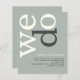 Un rapport qualité-prix BUDGET alternative sur une taille plus petite 4,5 x 5,6" semi-brillant poids 110lbs, qui est d'une épaisseur similaire à une carte postale (cependant ne convient pas à l'utilisation comme carte postale.) VEUILLEZ NOTER qu'il y a UN invitation par feuille. BUDGET Simple Sage Ivory Texte Mariage Invitation. Un design typographique moderne avec We Do en grande typographie en ivoire avec eux "d" en gris, tourné et à gauche sur un arrière - plan de vert sage clair. Les couleurs Arrière - plans et textuelles peuvent être modifiées si vous le souhaitez via Personnaliser.