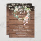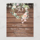 Doté d'une délicate marguerite fleurie d'aquarelle et de jolies lampes à cordes sur un arrière - plan de panneaux de bois, cette soirée rustique et chic surprise 50e anniversaire mariage invitation budgétaire peut être personnalisée avec vos informations spéciales d'anniversaire or. Au verso, une guirlande fleurie assortie encadre les dates d'anniversaire en texte blanc élégant sur un arrière - plan en bois. Conçu par Thisisnotme©