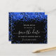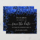 Un arrière - plan noir décoré de confettis bleu roi. Personnalisez et ajoutez une date et un nom/âge. Le texte : Save the Date est écrit avec un grand script de style à la main tendance.