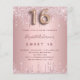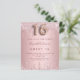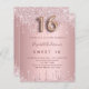 Une invitation moderne, élégante et glamour pour une soirée Sweet 16, 16e anniversaire de fille. Un rose poussiéreux, un faux arrière - plan rose à l'apparence métallique avec une élégante goutte de faux parties scintillant, look goutte à goutte de peinture. Le nom est écrit avec un rose moderne de couleur or foncé à la main écriture style. Personnalisez et ajoutez les détails de votre fête. Le numéro 16 est écrit avec une police de style ballon, script.
