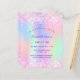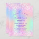 Une invitation à la fête de 16e anniversaire pour filles et femmes Sweet 16. Devant : Un arc-en-ciel, arrière - plan de couleur holographique en violet, rose, vert menthe, or rose. Décoré de faux parties scintillant rose vif, brille. Personnalisez et ajoutez un nom et des détails du parti. Le nom est écrit avec un script de style écrit à la main, des lettres de couleur violette.