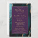 This elegant, modern wedding program features a teal agate background trimmed with gold faux glitter. The text appears in elegant gold-colored handwriting and copperplate fonts on a purple rectangle.