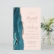 The left-hand edge of this elegant modern wedding invitation features a teal watercolor agate border trimmed with faux rose gold glitter. The customizable text combines handwriting, copperplate and italic fonts in dusty rose on a blush pink background. The reverse side features a matching teal and rose gold agate design.