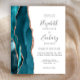 The left-hand edge of this elegant modern wedding invitation features a teal watercolor agate border trimmed with faux rose gold glitter. The customizable text combines handwriting, copperplate and italic fonts in charcoal gray on a white background. The reverse side features a matching teal and rose gold agate design. NOTE: Envelopes are not automatically included with these budget invitations, so please remember to choose the "white envelopes" option!