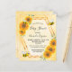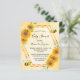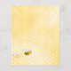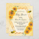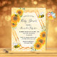 Invitation élégante et amusante pour une baby shower, neutre en termes de sexe. Fond jaune avec un motif de nid d'abeille doré. Avec un cadre géométrique en faux or. Tournesols jaunes et orange décoratifs et abeilles bourdon heureuses. Avec le texte : Baby Shower et le nom de la future maman abeille sur le devant écrit avec une police de caractères manuscrits moderne. Lettres noires.