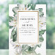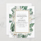 Budget Tropical Magnolia Flowers with Floral Greenery Palm and Faux Gold Foil Frontière géométrique Printemps ou Evénement Mariage Invitations - comprend une belle et élégante typographie script avec des fleurs tropicales modernes et la verdure pour la célébration spéciale de mariage.
