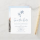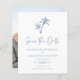 Ce mariage économique, sauf la carte datation, a un design simple et minimaliste sur la plage tropicale avec deux palmiers en haut, dans un jeu de couleurs blanc et bleu poussiéreux, avec un modèle photo à l'arrière.