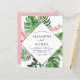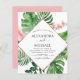 Budget Tropical Green Palm Feuilles et Blush Pink Flowers Aquarelle avec Faux Rose Gold Foil Forme géométrique Printemps ou été Mariage Invitations - comprend une belle et élégante typographie script avec des fleurs botaniques tropicales modernes et la verdure pour la célébration spéciale de mariage.