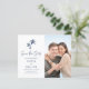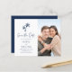 Cet élégant mariage de plage tropicale bleu marine BUDGET enregistrer la carte de date comporte deux palmiers au-dessus du texte, script d'écriture élégante pour le faire-part "Save the Date", et une photo du couple heureux.