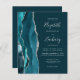 Le bord gauche de cette élégante faire-part de mariage moderne est doté d'une bordure turquoise en aquarelle bleue ornée d'une parties scintillant en faux argent. Le texte personnalisable combine écriture gris argenté, copperplate et polices italiques sur un arrière - plan turquoise foncé. L'envers offre des espaces pour 4 photos (1 carré, 2 horizontales, 1 verticale longue) et de la place pour l'URL de votre site mariage ou d'autres informations.