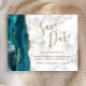 Cet élégant budget enregistrer la carte date dispose d'une bordure d'aquarelle bleue turquoise découpée avec une parties scintillant en faux or. Le texte personnalisable combine écriture manuscrite noir et or, polices cuivre et italique sur un arrière - plan en marbre gris et blanc. L'envers présente un design d'agate turquoise et or assorti.