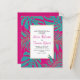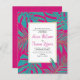 BUDGET turquoise, magenta rose et or monstère tropicale et palmier feuilles faire-part de mariage avec code QR à RSVP en ligne. Il comprend un motif de feuilles tropicaux en bleu turquoise avec contour doré sur rose fushia et votre texte dans un cadre blanc. L'arrière comprend un motif à points de polka doré sur arrière - plan magenta et le code QR.