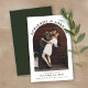 Faire-part de fiançailles avec photo à sauver sous thème d'arche moderne bohème. Annoncez vos fiançailles avec ce faire-part créatif et unique mettant en vedette votre photo et notre arche tendance et élégante. Celui-ci est moderne vert foncé et blanc, mais toutes les couleurs et polices sont faciles à personnaliser !