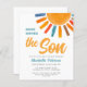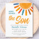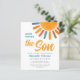 Famille Invitation et amis à votre baby shower sur le thème du soleil avec cette invitation de baby shower pour garçons de soleil mignon. Il présente le texte "Here Comes The Son" dans une typographie élégante avec un soleil aquarelle aux couleurs vives. Facile à personnaliser. Aquarelle originale © Michele Davies.