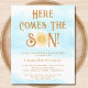 Famille d'Invitations et amis à votre baby shower sur le thème du soleil avec cette invitation de baby shower pour garçons budget mignon. Il présente le texte "Here Comes The Son" dans une typographie brune élégante avec un joli soleil d'aquarelle jaune et un arrière - plan de ciel bleu. Facile à personnaliser. Utilisez l'outil de conception pour modifier la taille, le style ou la couleur du texte. Parce que nous créons notre oeuvre, vous ne trouverez pas cette image exacte d'autres designers. Aquarelle originale © Michele Davies.