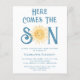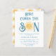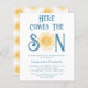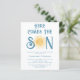 Famille d'Invitations et amis à votre baby shower sur le thème du soleil avec cette invitation de baby shower pour garçons budget mignon. Il présente le texte "Here Comes The Son" en typographie rétro bleue avec un joli soleil d'aquarelle jaune. Le dos est décoré d'un motif souriant. Facile à personnaliser. Aquarelle originale © Michele Davies.