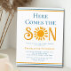 Famille d'Invitations et amis à votre baby shower sur le thème du soleil avec cette invitation de baby shower garçon élégant budget. Il présente le texte "Here Comes The Son" en typographie rétro élégante avec un soleil d'aquarelle jaune. Facile à personnaliser. Parce que nous créons notre oeuvre, vous ne trouverez pas cette image exacte d'autres designers. Aquarelle originale © Michele Davies.