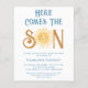 Famille d'Invitations et amis à votre baby shower sur le thème du soleil avec cette invitation de baby shower pour garçons budget mignon. Il présente le texte "Here Comes The Son" en typographie rétro bleue avec une jolie aquarelle jaune souriante soleil. Facile à personnaliser. Parce que nous créons notre oeuvre, vous ne trouverez pas cette image exacte d'autres designers. Aquarelle originale © Michele Davies.