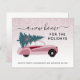 Une voiture en or rose et rousse avec un arbre de Noël turquoise attaché sur le dessus permet à la famille et aux amis de savoir que vous avez déménagé pendant les vacances. Créé avec les dames de patrons en tête, cette parties scintillant de style féminin, à l'ombre d'un faire-part à budget variable, vous permet de combiner votre accueil de Noël annuel avec vos nouvelles informations d'adresse. Devant la carte, l'exemple de texte dit, "Une nouvelle maison pour les vacances" dans la coordination sans serif et élégant script typographie. Au verso de la carte, vous pouvez modifier le texte avec vos nouvelles informations de contact et un accueil chaleureux de vacances. Tout le texte peut être changé facilement sur le modèle de personnalisation.