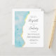The left-hand edge of this elegant modern wedding invitation features an aqua blue watercolor agate border trimmed with faux gold foil. The customizable text combines handwriting, copperplate and italic fonts in charcoal gray on a white background. The reverse side provides space for wedding details on a solid white background, along with a QR code guests can scan to visit your website and RSVP, which saves the cost of printing and mailing separate RSVP cards.