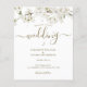 Invitation de mariage économique à fleurs blanches, avec de délicates fleurs de printemps encadrant les détails de votre mariage en lettres dorées élégantes. Personnalisez avec les informations de votre événement spécial. Le verso présente des pétales de fleurs blanches dispersés. Conçu par Thisisnotme©.