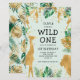 Célébrez votre premier anniversaire sauvage avec cette invitation à thème safari dans la jungle, avec des animaux en fausse feuille d'or (girafe, lion et singes), des feuilles de jungle d'or et verte, et un arrosage de confettis d'or. Ajoutez le nom de votre enfant et les détails de votre fête en texte noir sur un arrière - plan vert pâle. Un motif coordonné de feuillage de jungle en vert et or orne le dos de la carte.