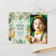 Invités Invitations pour fêter le premier anniversaire de votre enfant avec cette invitation à thème safari jungle, avec une collection de feuillage et d'animaux en faux feuille vert et or (girafe, lion, singe) autour des mots "Wild One" dans la typographie dessinée à la main sur un arrière - plan vert pâle. Remplacez facilement l'exemple d'image par votre photo préférée du garçon ou de la fille d'anniversaire. Le dos de la carte est orné d'un motif vert et doré de feuillage de la jungle.