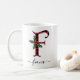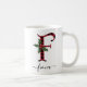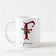 Buffle noir et rouge Plaid F Monogramme Xmas Mug à café avec un mignon Une lettre initiale avec un motif à plaid de buffle et un élément d'aquarelle de la feuille de biseau. Le modèle de nom personnalisé sous le monogramme F est dans une police de calligraphie manuscrite tourbillonnant avec des fioritures. Offrez une tasse de Noël personnalisée et attentionnée en cadeau de vacances d'hiver ou en rembourrage. Pour une autre lettre de monogramme, consultez la section "Autres produits de cette collection" ci-dessous.